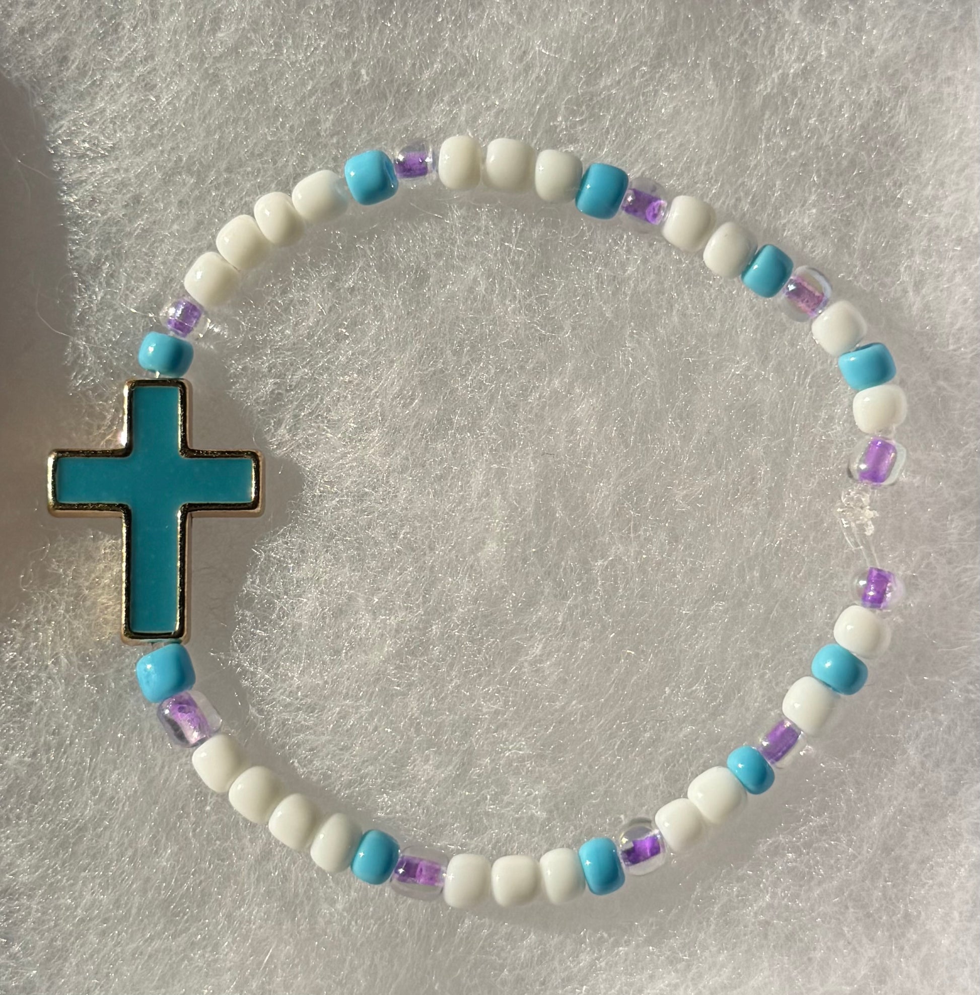 Blue, White & Purple Bead Bracelet with Turquoise Cross