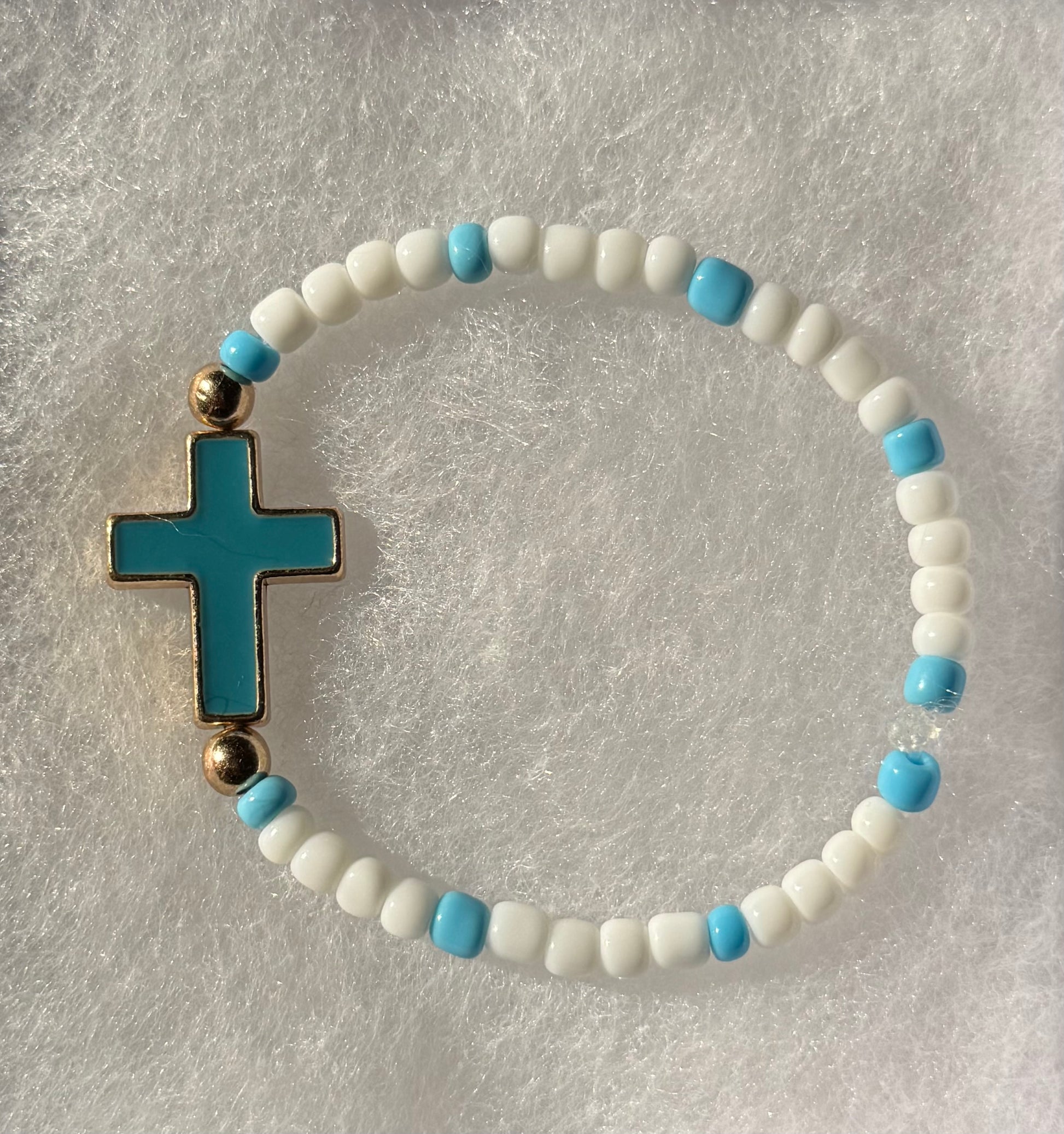 This handcrafted bracelet is made with intention, combining white and blue glass beads to reflect clarity, peace, and spiritual protection. The soft stretch cord offers a comfortable, flexible fit, while the gold and turquoise cross charm serves as a sacred symbol of faith, divine guidance, and healing energy. Wear it as a daily reminder to trust your path and stay connected to your higher self.