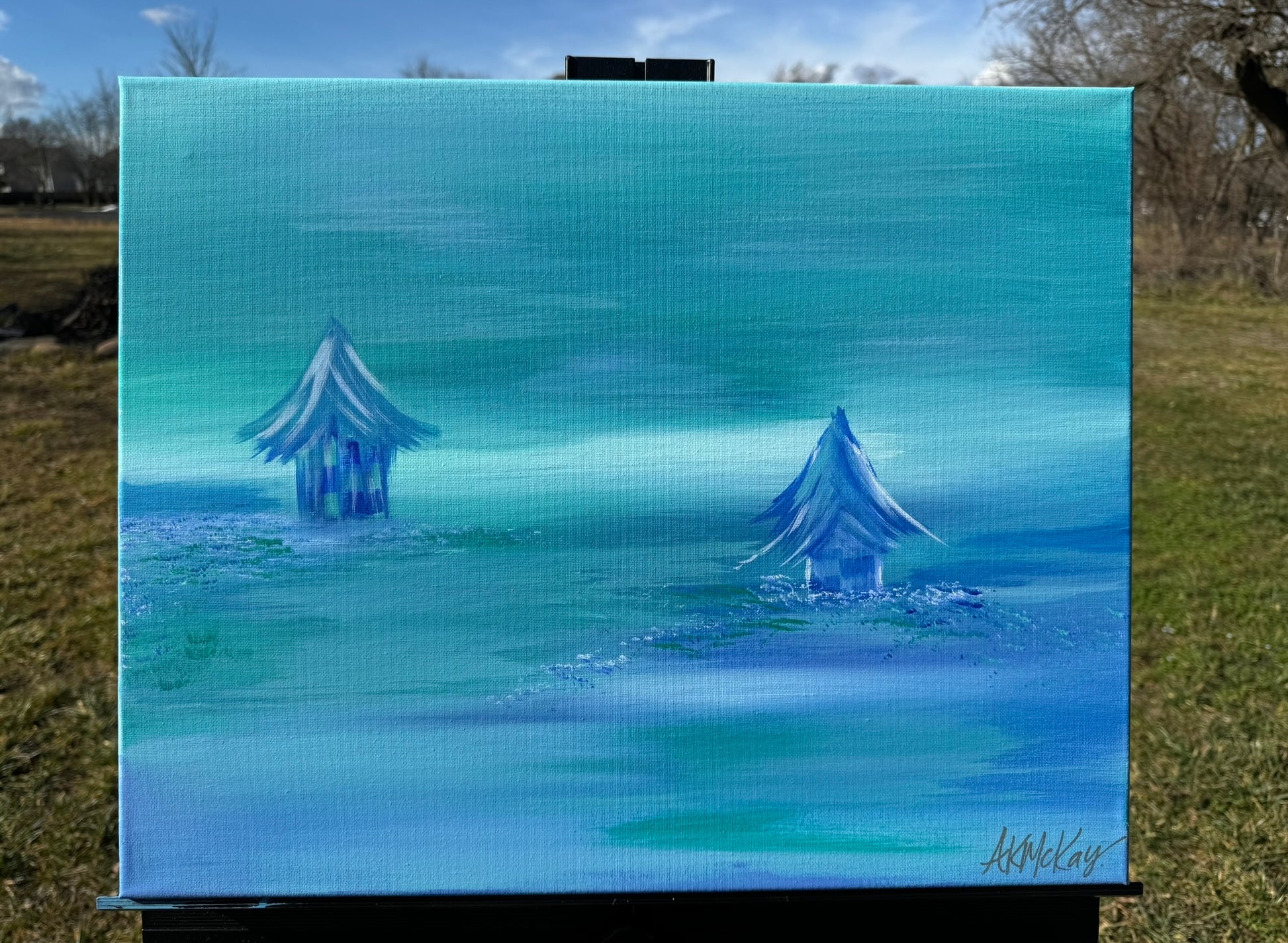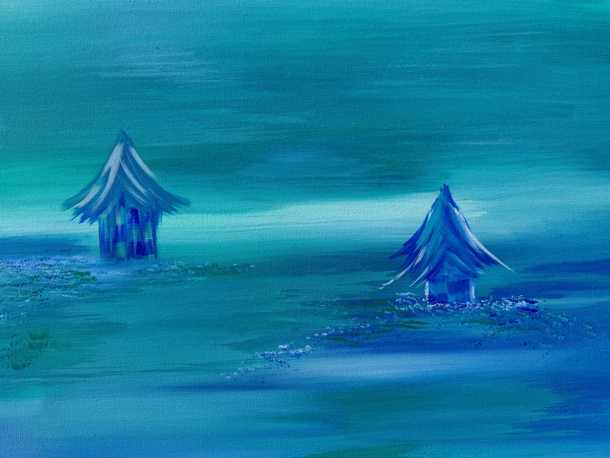 ”I felt like my head was going to explode, too much back and forth, too many people involved, no solution being found - this is how I felt right before I started this painting. I was about to loose it. So instead of having a nervous breakdown.. I stood up, walked over to my bin of paints, picked out 3 blues and a white, and started painting. Silence, PEACE, and concentration overtook my mind. I entered my flow state and centered myself. This experience reminded me how amazing and important art is to me on a mental and spiritual level. Creating this painting made me remember one of the main reasons I love to paint and how special it is to me to always have a space for art in my life. Truly, my escape.”